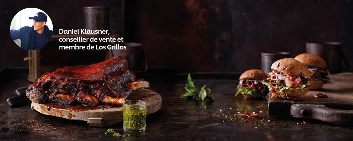 Essaie donc notre recette à succès «Côtes de bœuf grillées avec chimichurri» du champion suisse de grillade ou notre «Pulled Beef Burger avec pain aux noix cuit dans un Dutch Oven».