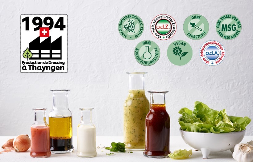 Depuis 1994, notre dressing, ou sauce salade, est produit à Thayngen. Rien qu’en 2023, cela représentait plus de 750 000 litres de sauce salade pour la Suisse