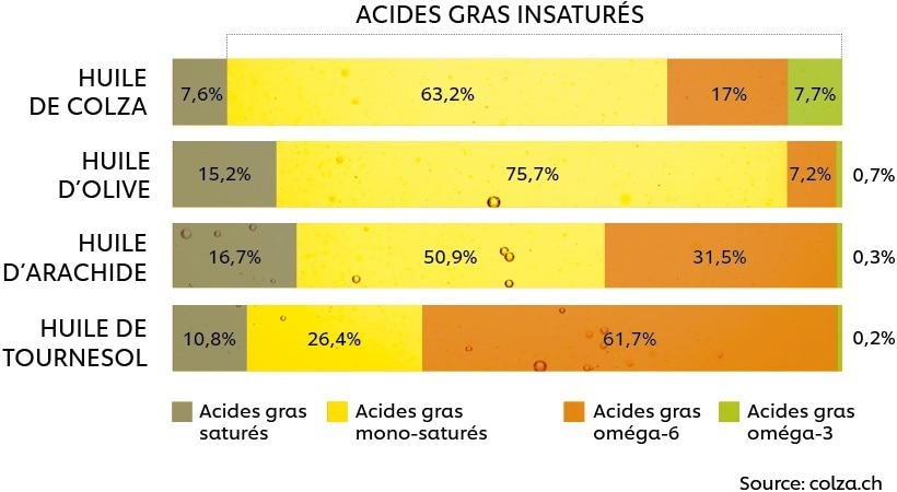 + L’huile de colza présente la teneur la plus élevée en acides gras insaturés