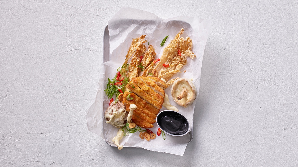 Frittiertes Kimchi mit veganem Schnitzel und Pilzen dazu geschwärzte Mayonnaise