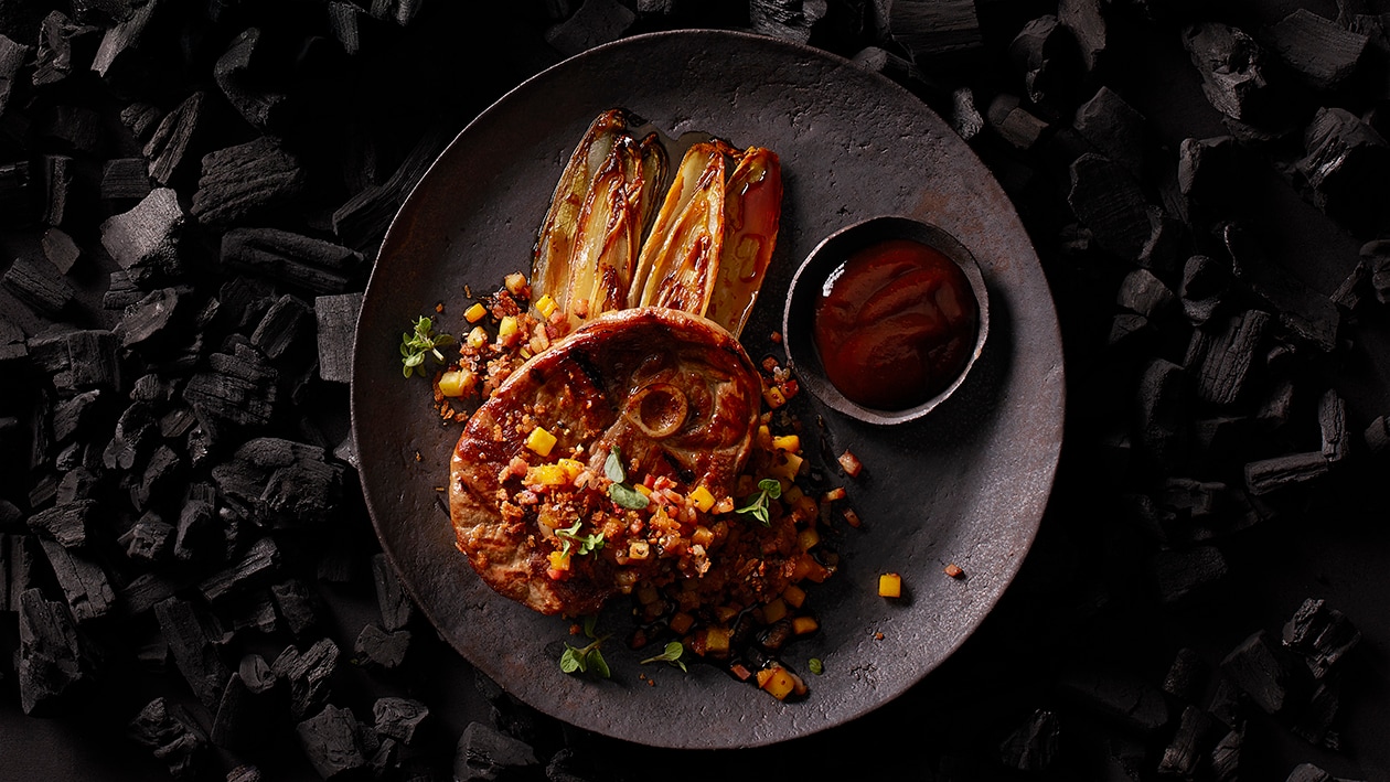 Grilliertes Gigotsteak mit glasiertem Chicorée und BBQ Sauce