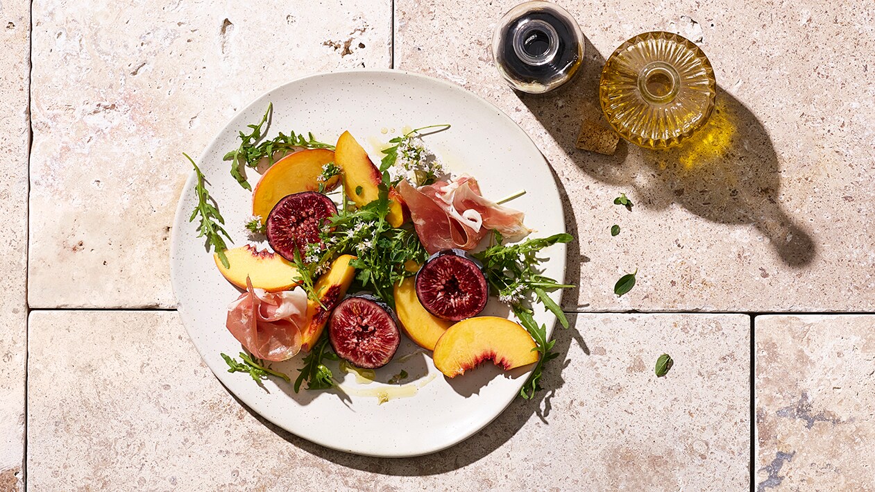 Insalata estiva di fichi e pesche con prosciutto di Parma e rucola