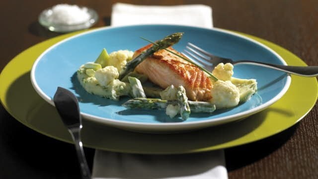 Gebratener Lachs mit Meerrettich-Hollandaise, Schnittlauchpüree, Spargel, Blumenkohl