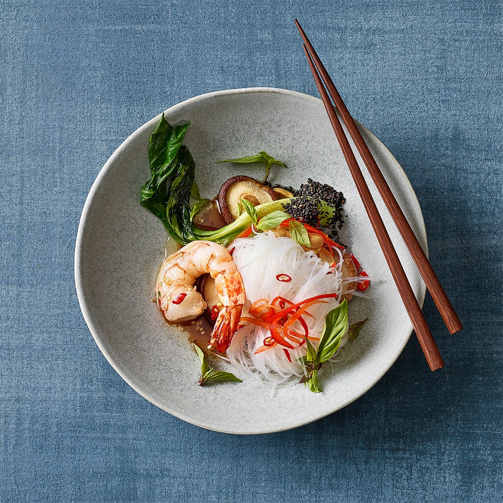 Thailändischer Glasnudelsalat mit sautierter Riesencrevette und Soja-Sesam-Vinaigrette