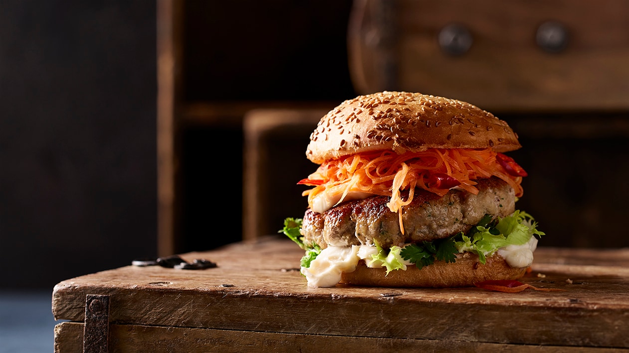 Burger de porc à la citronnelle et sauce à l'ail