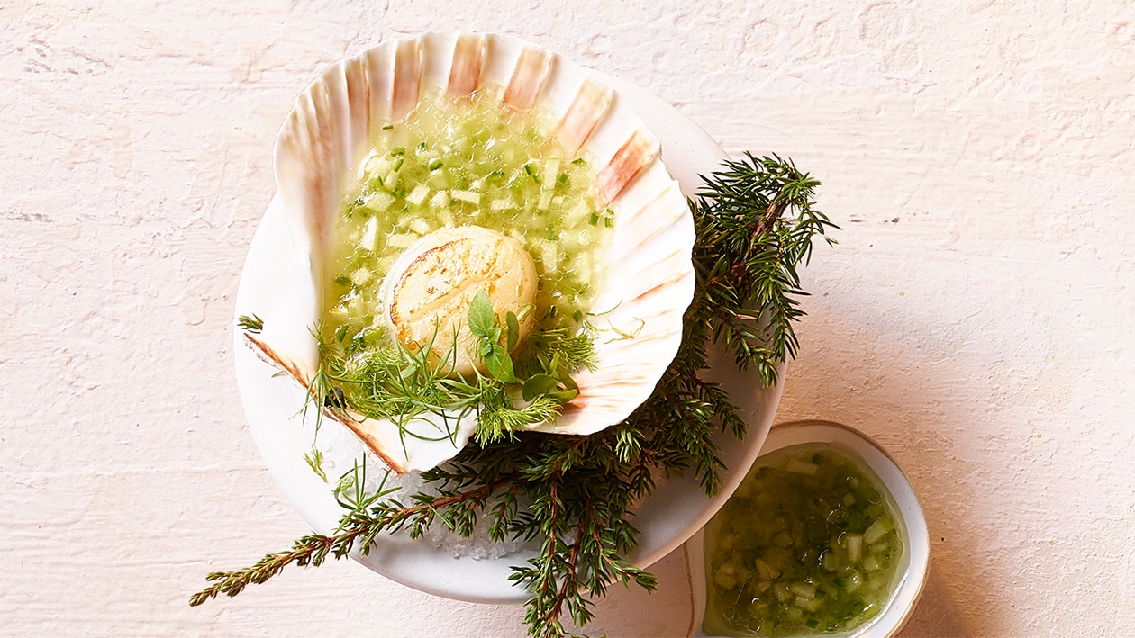 Coquilles St-Jacques fumées à la vinaigrette céleri-pomme
