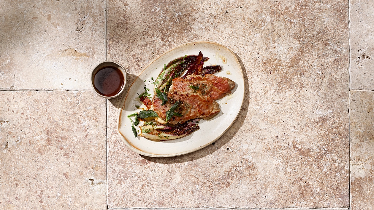 Trévise marinée accompagnée d'une saltimbocca et d'une vinaigrette balsamique
