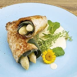 Déclinaison d'asperges vertes sur brioche chaude et croustillante et hollandaise au café