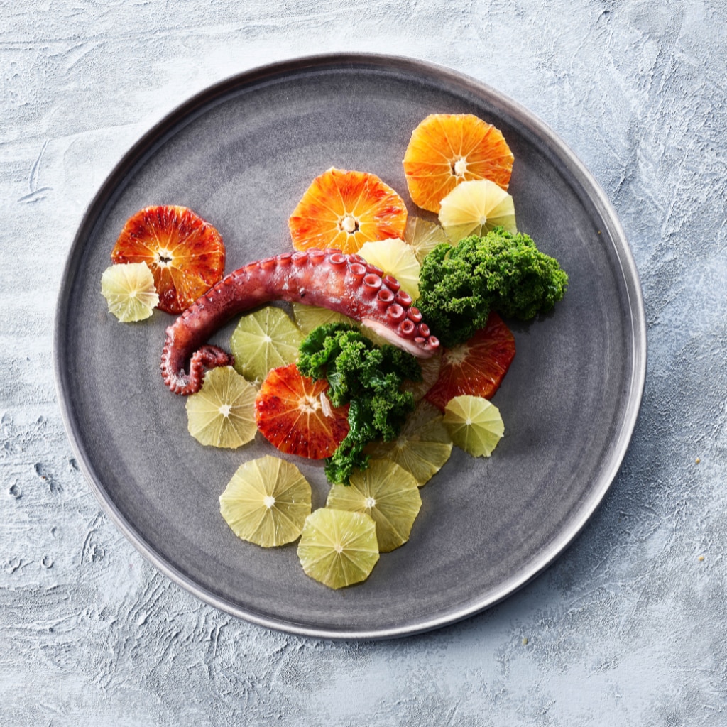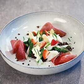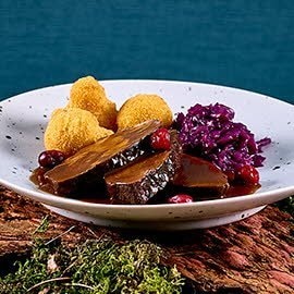 Magret de canard fumé et rôti, sauce aux cerises, scones aux épices et chou étuvé