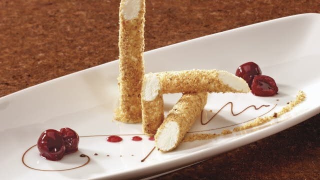Parfait glacé à la cardamone en robe de croquants d'amandes et compote de cerises
