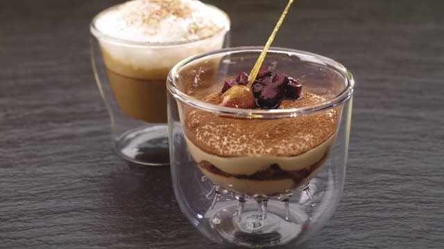 Café glacé et griottes crémeuses, biscuit et crème au Kirsch montée