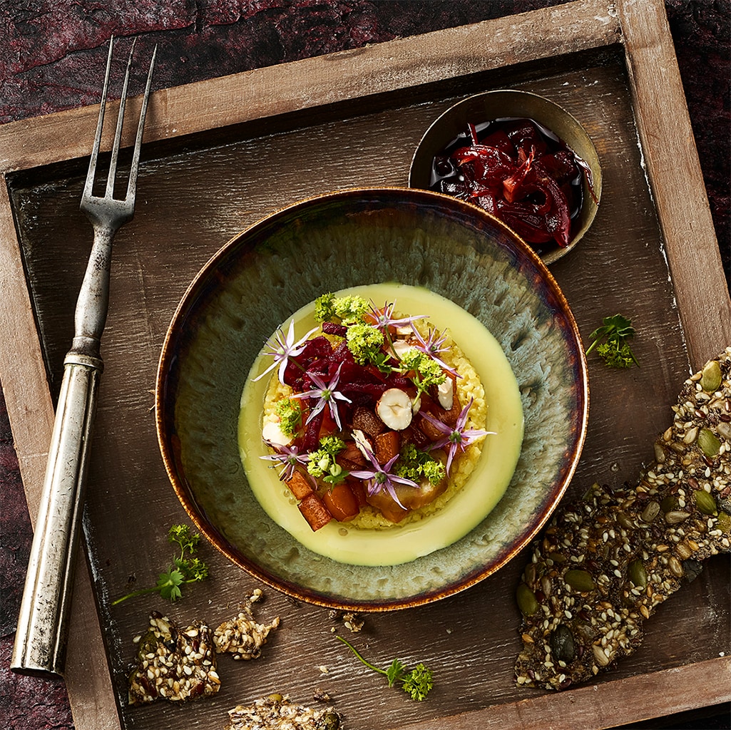 Salade de couscous au pain croustillant, potiron et chutney d'oignons