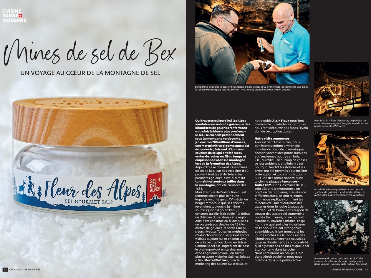 En plus du sel conventionnel SEL DES ALPES, le sel gourmet « Fleur des Alpes » est produit au cœur de la montagne de sel de Bex – un sel exclusif créé selon une méthode ancestrale.